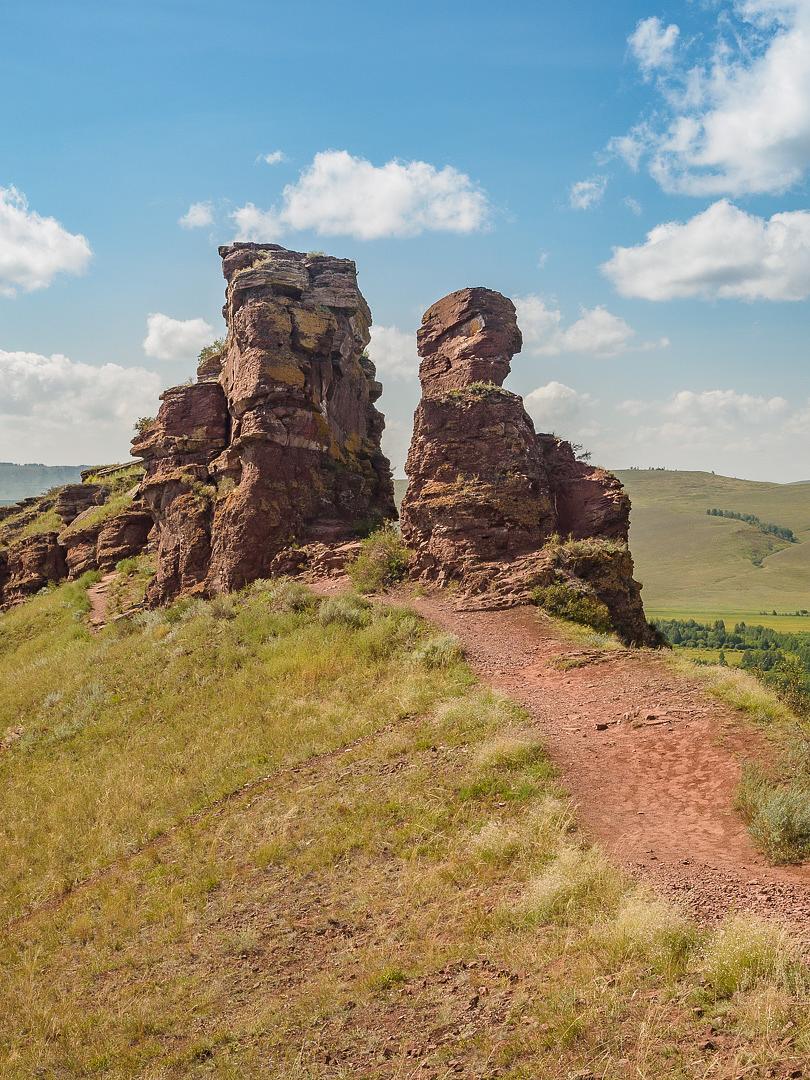 - Пеший маршрут по тропе начинается у моста через Белый Июс в Хакасии. Тропа идет по высокому берегу реки опускаясь и поднимаясь, проходя по долинам, аркам и крутым склонам. Древнее название этого уникального скального массива - «Тогыс Аз», что означает «Девять ртов». И действительно, если посмотреть с противоположного берега можно увидеть 9 больших гротов, похожих на раскрытые рты;