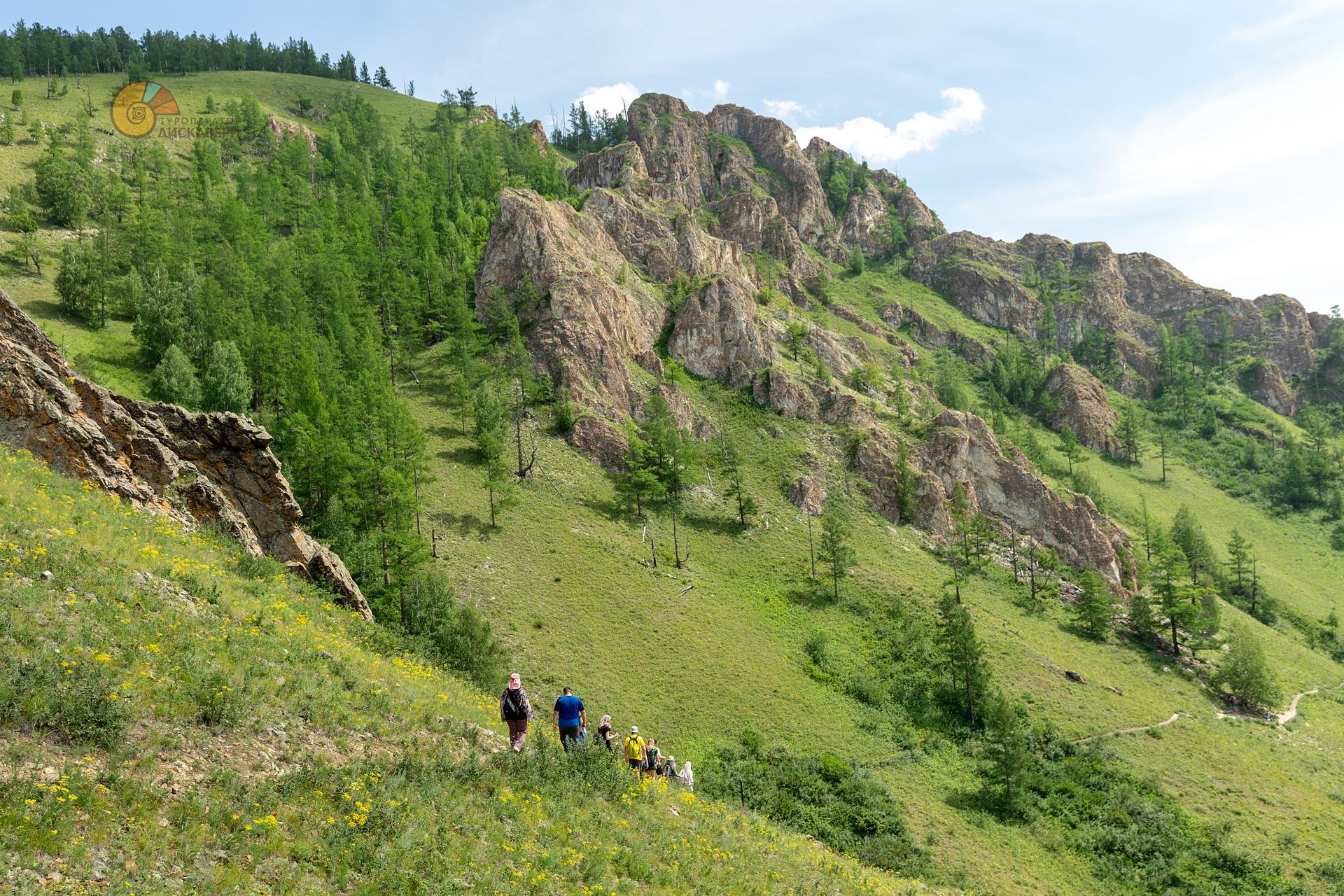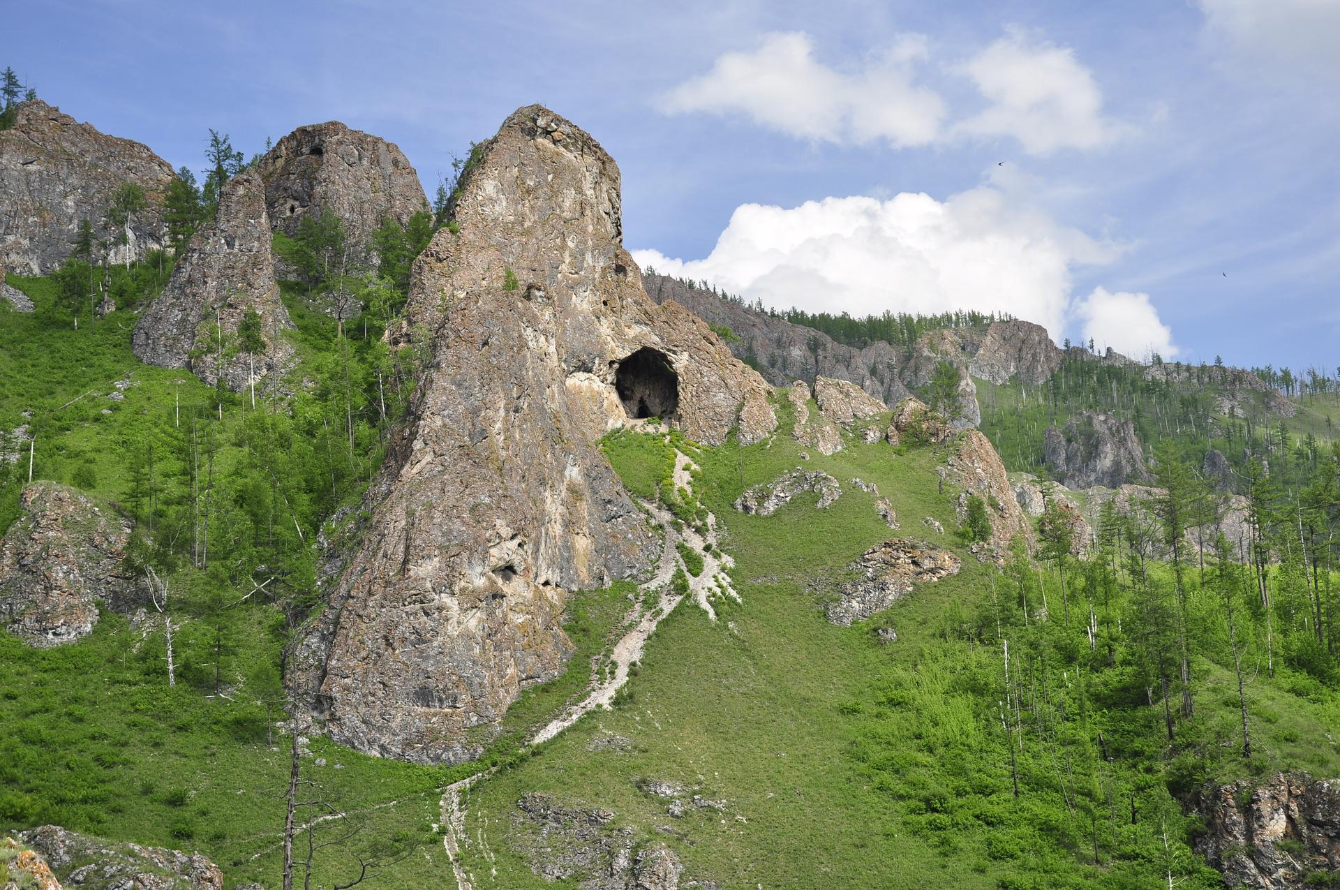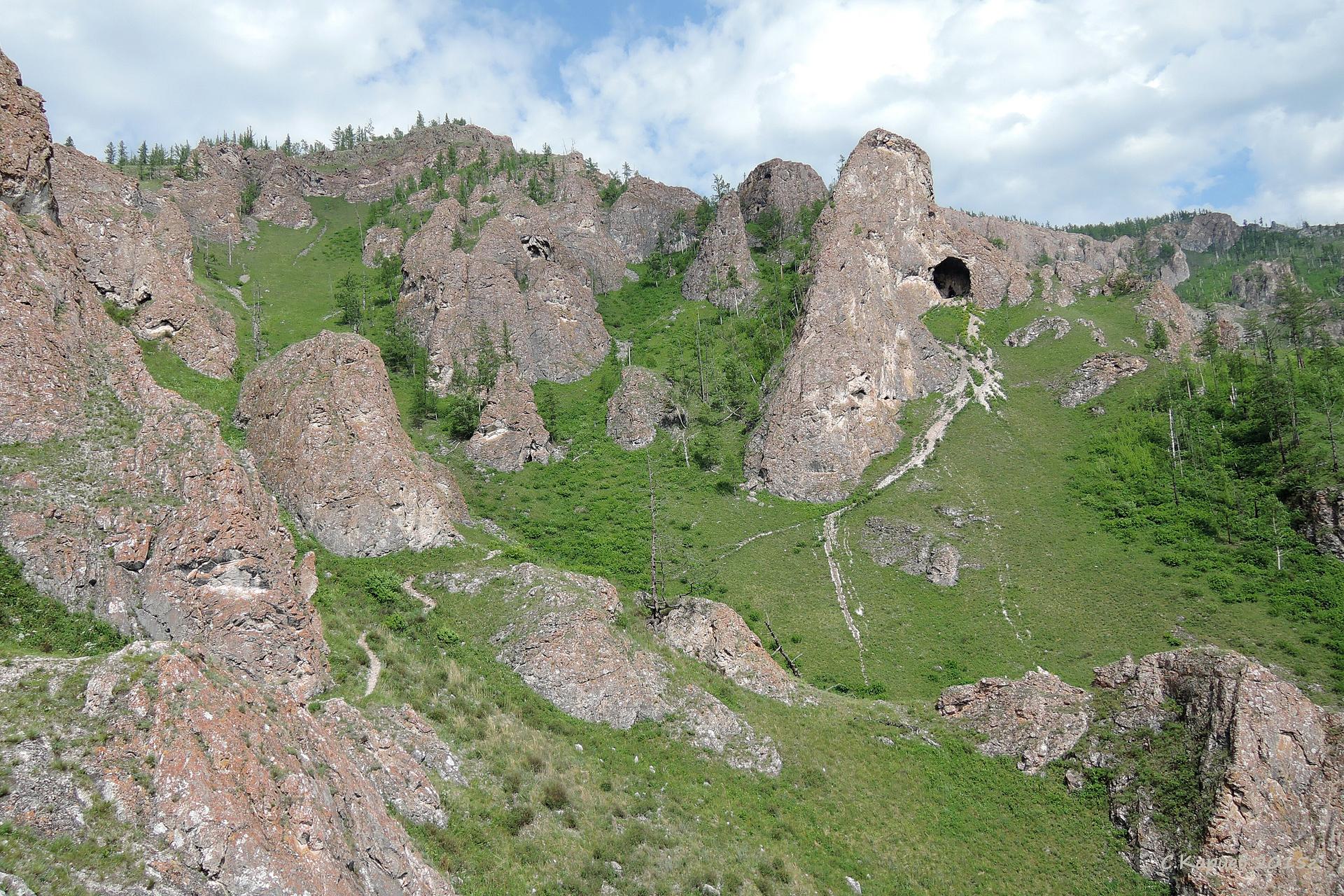 От грота тропа выводит на гребень хребта, откуда открывается живописный вид на долину Белого Июса. Далее вверх по склону, мимо скал "пальцев", мимо остатков древней медеплавильной печи, через арку тропа поднимается и уходит все дальше, продвигаясь от пещеры к пещере.