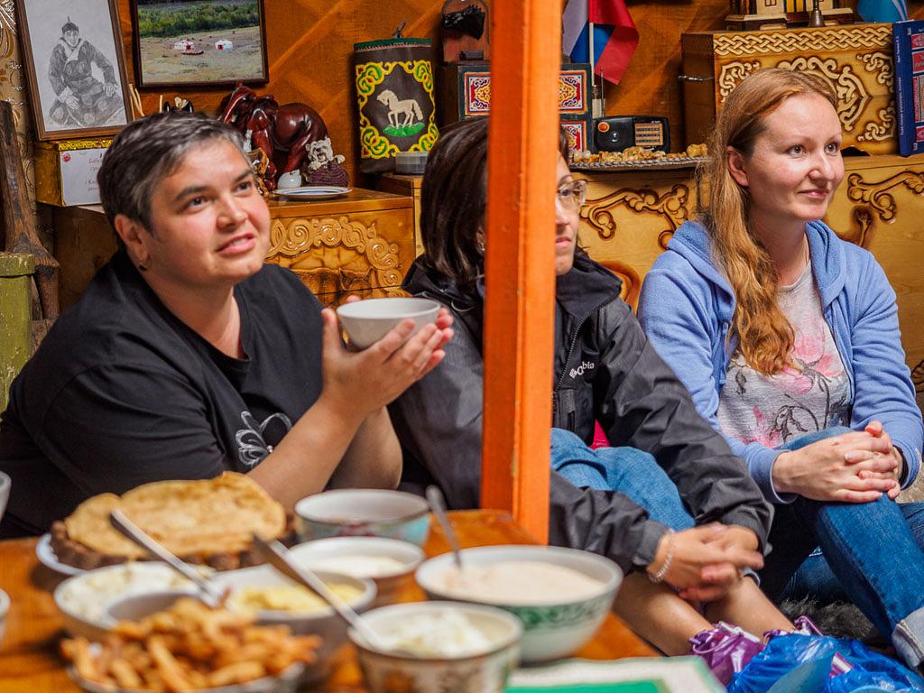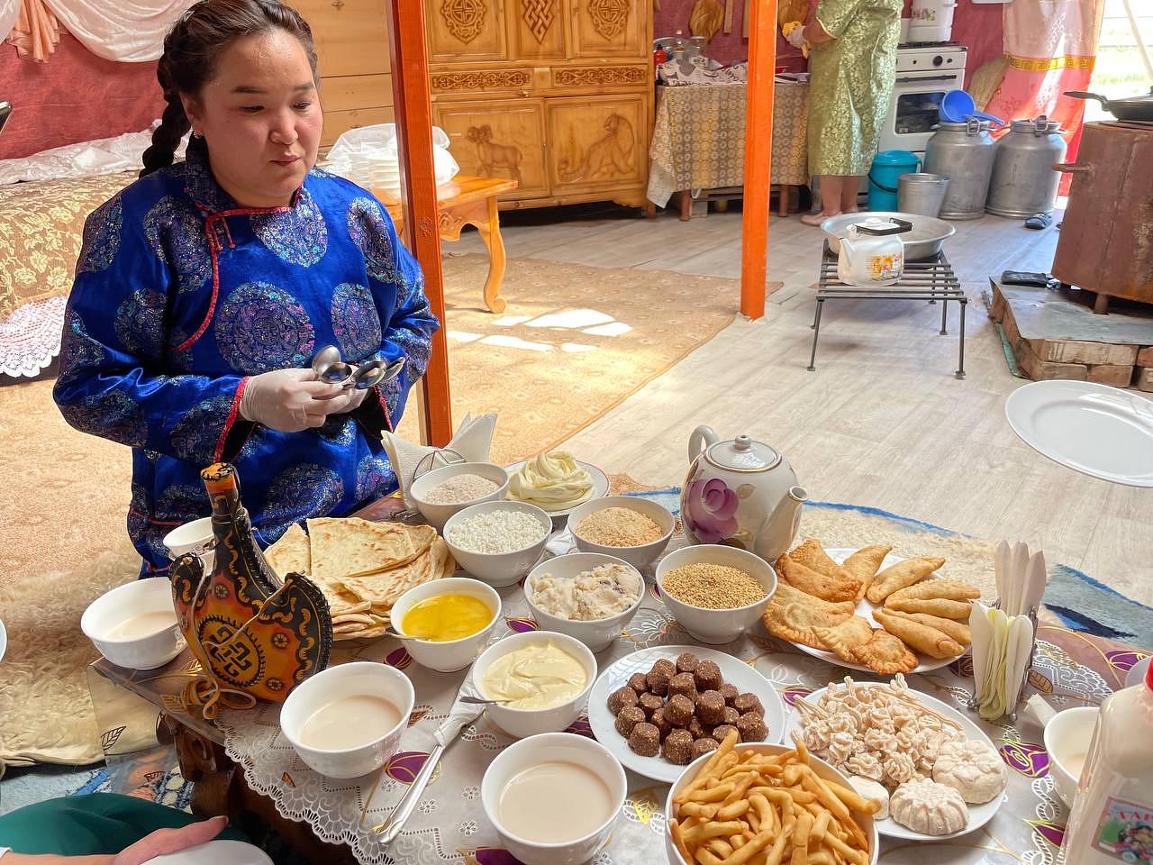- Ужин в тувинских традициях, национальные блюда (баранина, приготовленная по традиционным рецептам, местные тушеные овощи, тувинские буузы из говядины или баранины, молодой сыр, печенье боорзаки с тувинским чаем с молоком и солью).